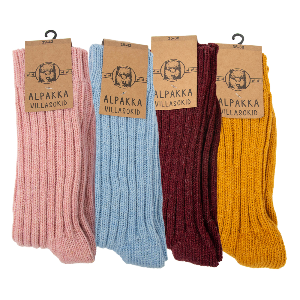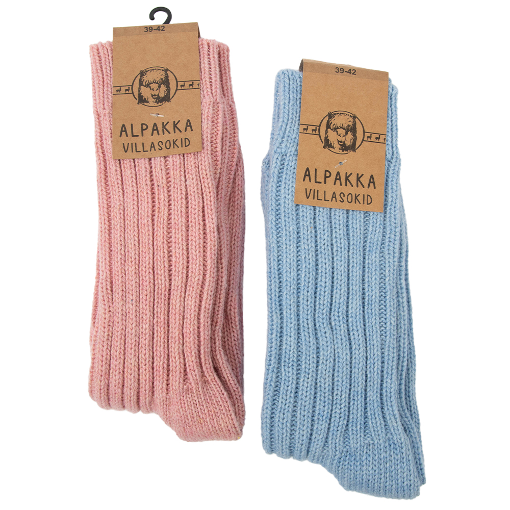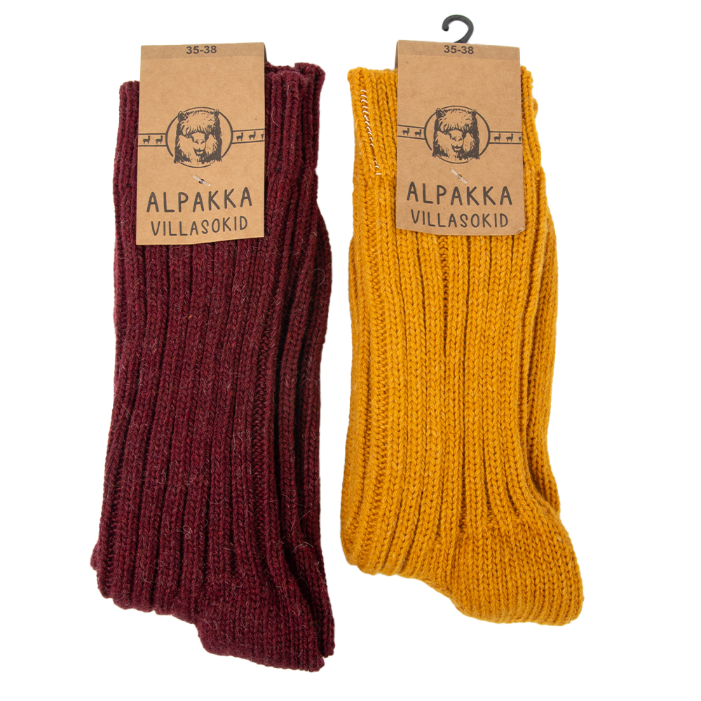 Alpakavilla sokid, pakendis kaks paari. Kooslus 40% alpaka vill, 48% lambavill ja 12% polüamiid.